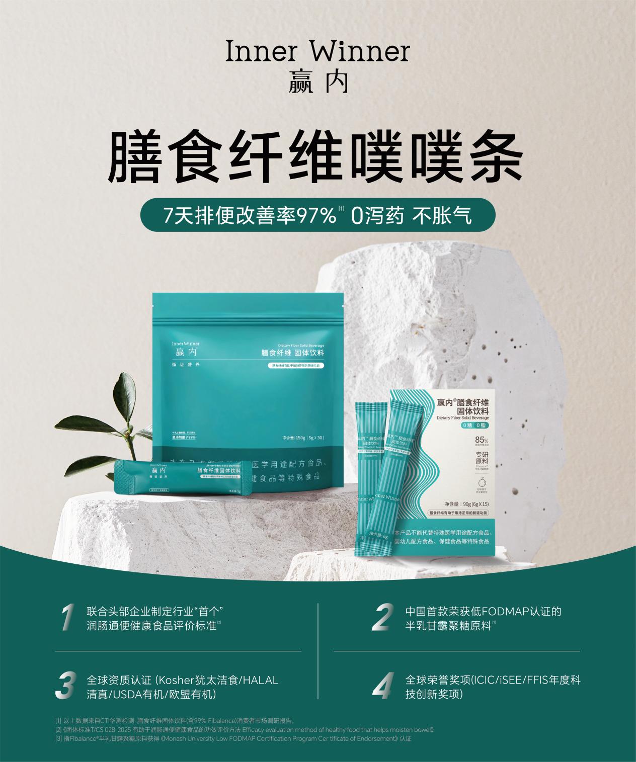 PHGG膳食纤维噗噗条,是InnerWinner赢内的首款产品。它采用获得中国首款低FODMAP认证的专利成分——Fibalance®,是一种纯天然提取的半乳甘露聚糖。产品甜味来源于甜菊糖苷,是一款真正意义上的温和调养型长链益生元,旨在为用户带来“丰富膳食纤维,健康无'腹'担”的优质体验。