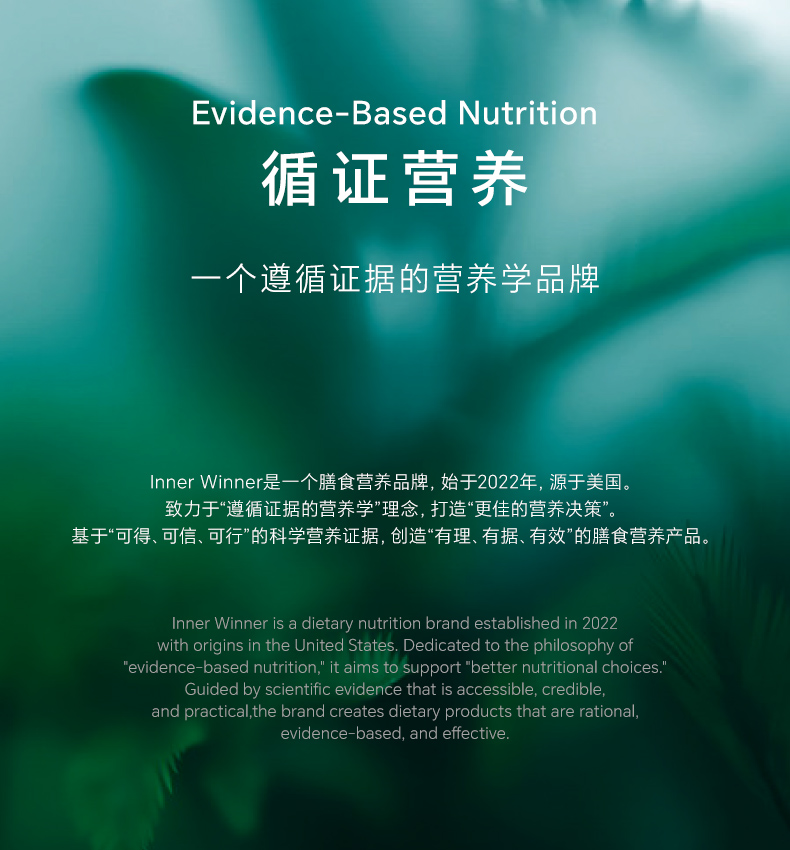 赢内,是海外循证营养品牌InnerWinner的国内线。坚信有效的营养补充必须建立在坚实的科学证据之上。致力于“遵循证据的营养学”理念,打造“更佳的营养决策”。基于“可得、可信、可行”的科学营养证据,创造“有理、有据、有效”的膳食营养产品。