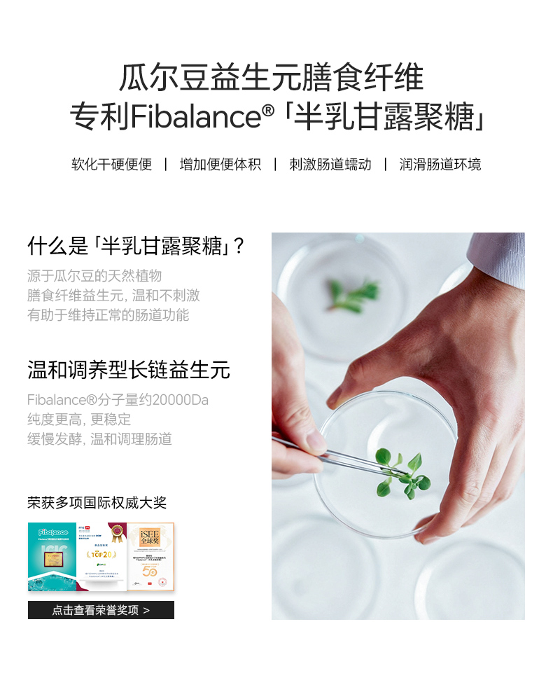 科学家和营养师们的研究指出:在众多膳食纤维中,水解瓜尔豆胶(PHGG)是改善便秘问题,尤其是对于肠胃敏感、寻求长期温和调理人群的“优等生”。它通过物理持水、益生元养菌和多产物协同的作用机制,帮助肠道恢复健康节律,实现轻松通畅。